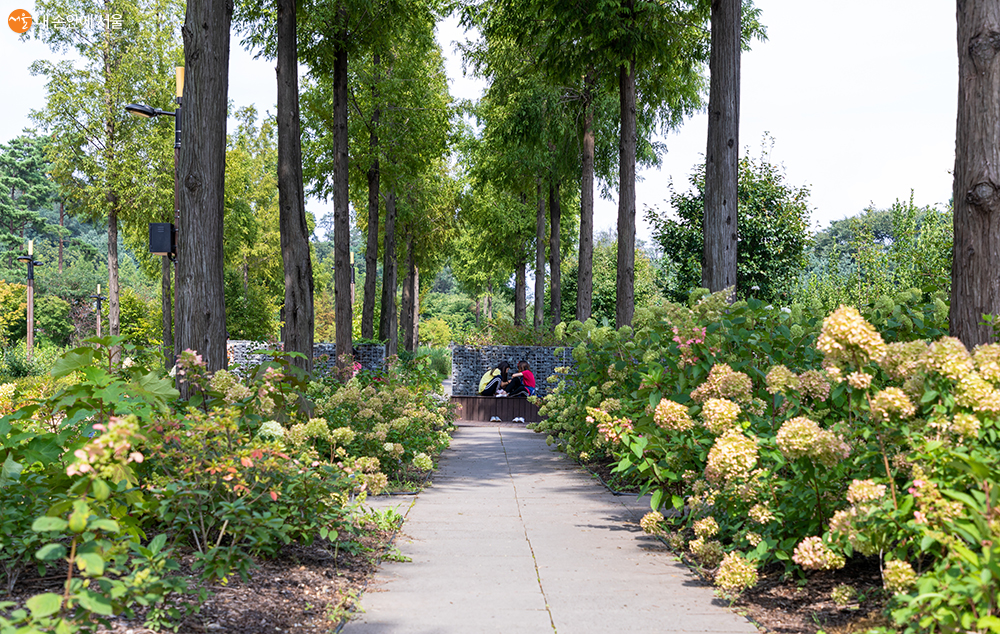 큰 키의 메타세쿼이아가 줄지어 서 있는 ‘억새원’ 각각의 테마 정원을 구분 짓는 돌 담장과 벤치의 그늘은 휴식하기 좋은 명소다. ⓒ양인억