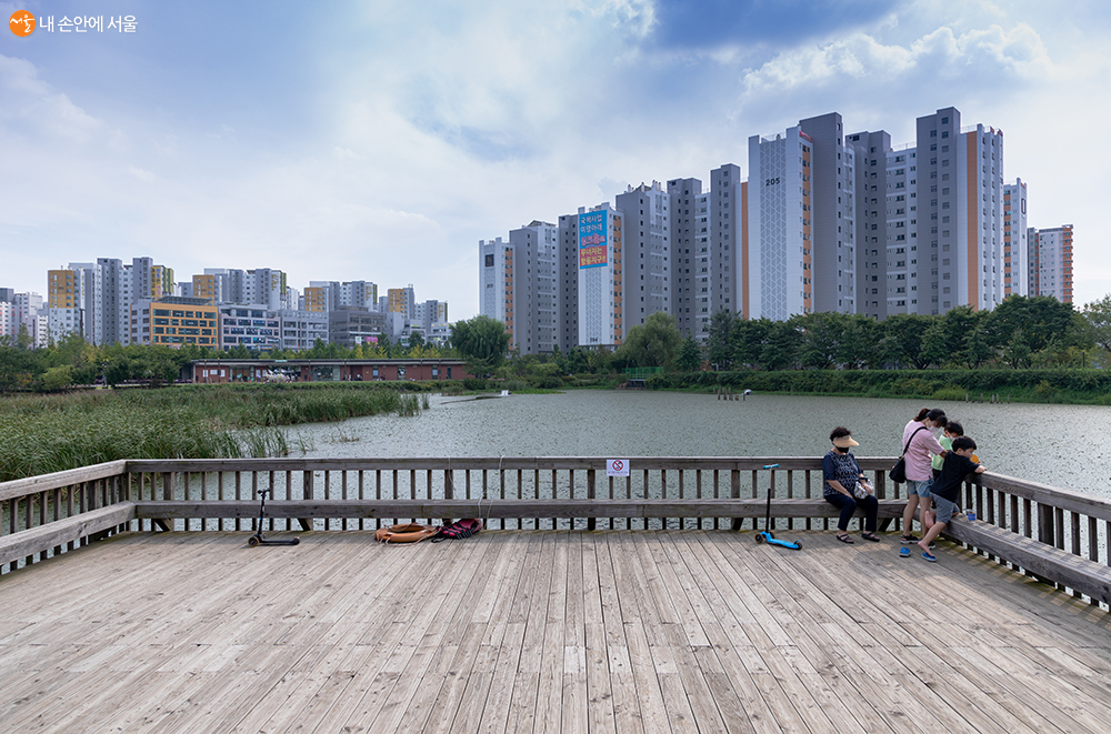 항동저수지에 한 쪽에 설치된 나무 데크. 제법 넓은 곳으로 할머니와 함께 나온 손자들이 저수지에서 먹이를 찾아다니는 청둥오리를 바라보며 즐거워하고 있다. ⓒ양인억