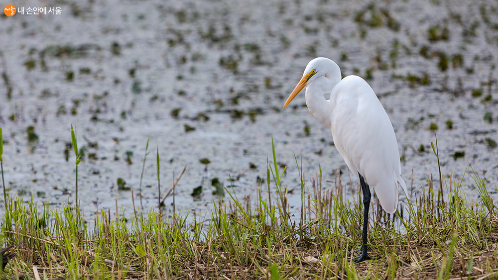 항동저수지의 뭍에서 잠시 쉬고 있는 쇠백로. 저수지가 제법 커서 그런지 다양한 새들을 만날 수 있다. 쇠백로 이외에도 청둥오리, 왜가리, 물닭들을 만났다. ⓒ양인억