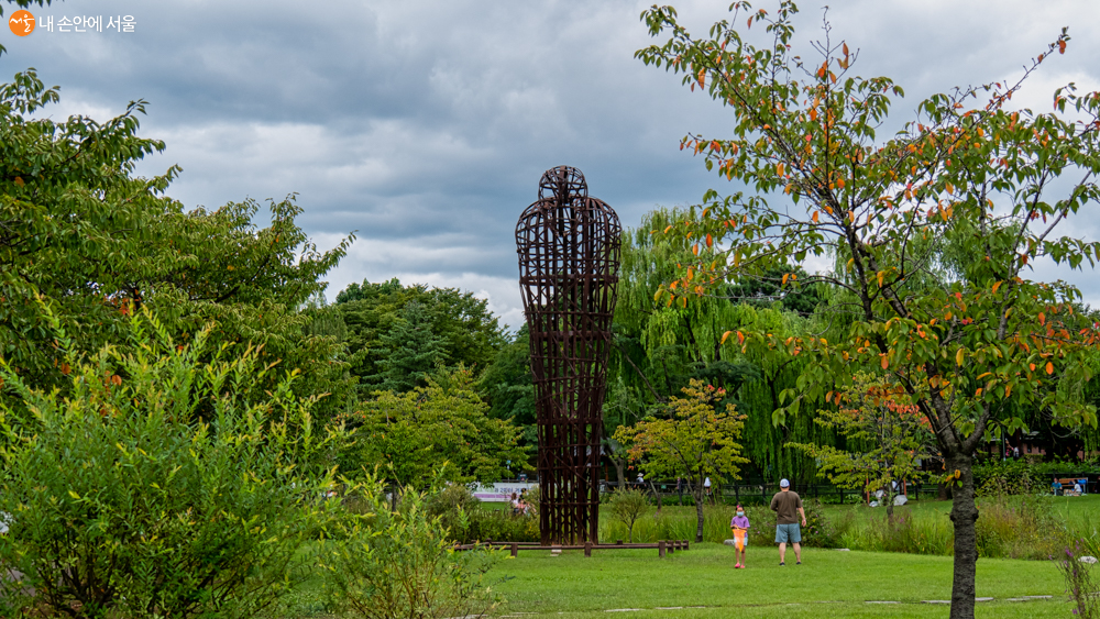 조형물 Figure가 밤나무 아래 아이들 모습과 대비되어 걸리버의 여행기 속 장면을 떠올리게 한다 ⓒ오세훈