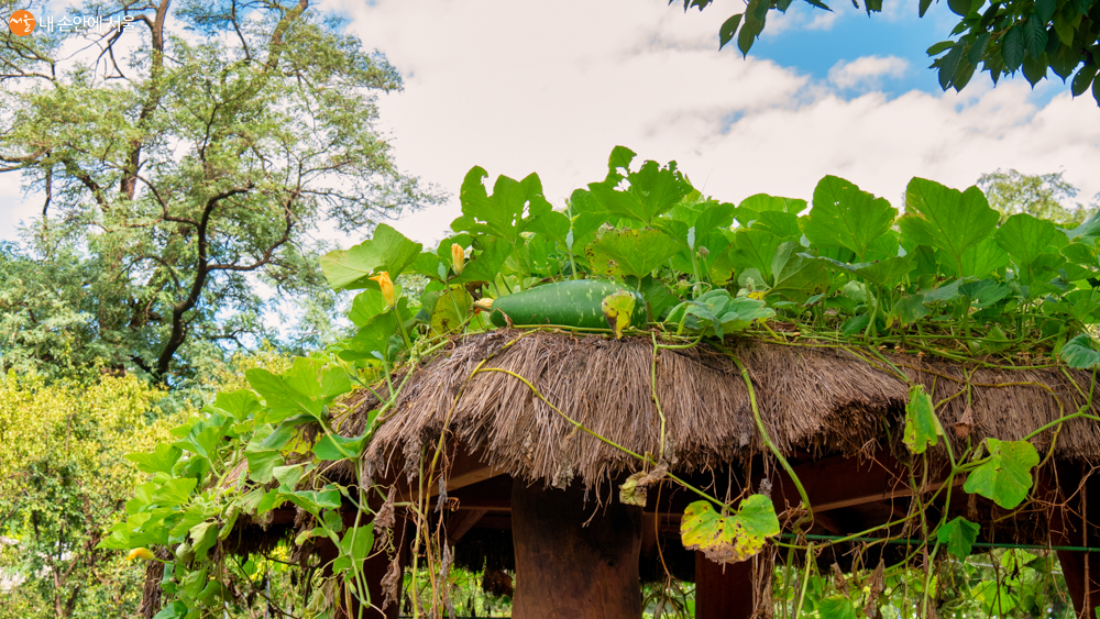 공원내 시민텃밭 원두막 위 넝쿨 사이의 커다란 호박이 탐스럽다 ⓒ오세훈