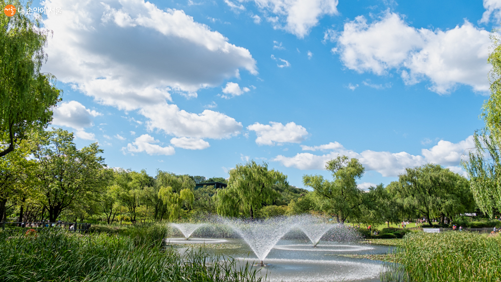 공원 초입에서 마주치는 연못의 분수와 파란 하늘이 평화롭다 ⓒ오세훈