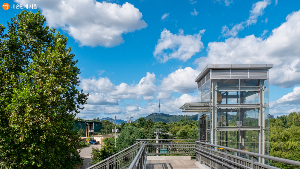 용산가족공원 입구 육교 위에서 바라보이는 공원 너머 남산 모습이 지척에 있는 듯 선명하다 ⓒ오세훈