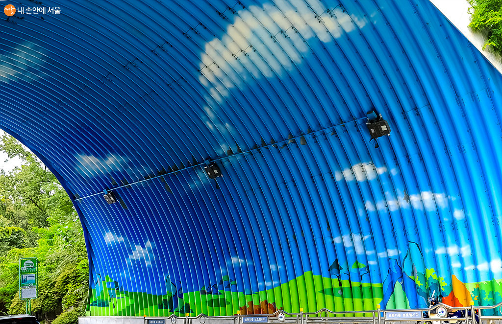 우장산 입구에서 만나게 되는 구름다리. 작은 터널 안 벽면에는 파란 하늘이 그려져 있다 ©박우영