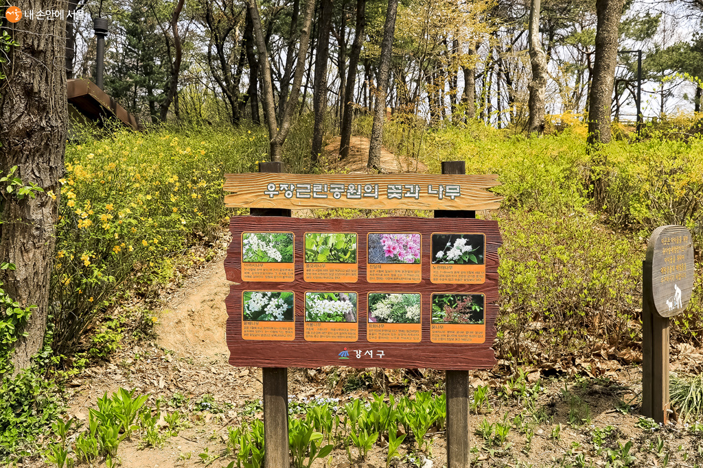 우장산 근린공원의 숲속에 피는 다양한 꽃과 나무들을 안내한 표지판 ©박우영