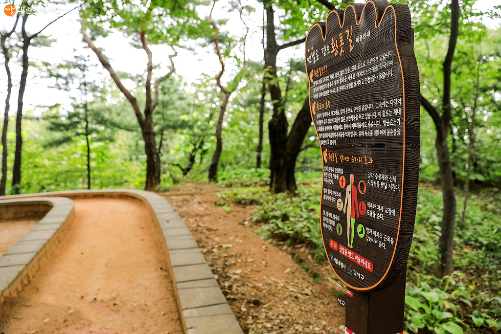 맨발로 걷는 황톳길 입구에는 황톳길 효능이 적혀 있다 ©박우영