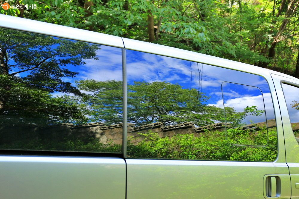 주차된 자동차의 유리창에 비친 정릉동의 초가을 풍경 ⓒ이재몽