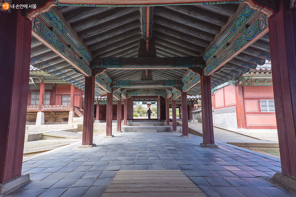 익랑 안쪽에서 본 모습. 명정전과 문정전을 오가는 왕을 위한 길로 붉은 기둥과 은은한 단청으로 치장한 지붕의 나열이 아름답다 ⓒ양인억