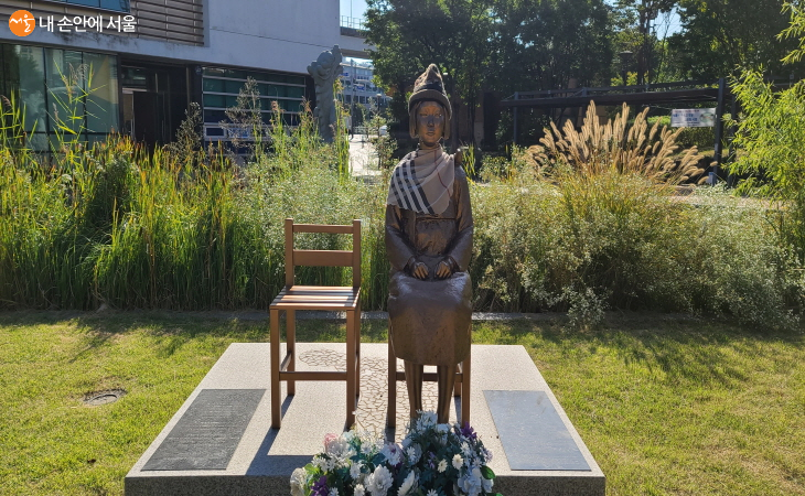 용두공원에는 또 다른 명물이 있다. 바로 작년에 제막식을 마친 평화와 자유를 상징하는 ‘평화의 소녀상’이다. 평화를 상징하는 새가 소녀의 어깨 위에 앉은 이 소녀상은 높이 1m 23㎝의 아담한 크기다. 소녀상 아래 건립취지문에는 '일제강점기 일본군 성노예로 끌려간 소녀들의 상처를 보듬어주고 평화와 인권이 실현되는 아름다운 세상을 위한 소망을 담아 건립합니다'라고 적혀져 있는데 읽는 내내 마음이 아려온다.