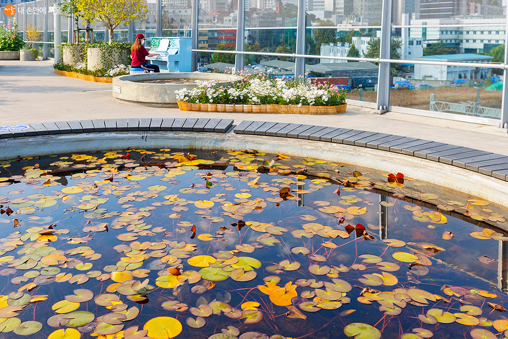 수생식물이 자라는 연못, 구절초, 그리고 피아노 치는 시민 ⓒ문청야