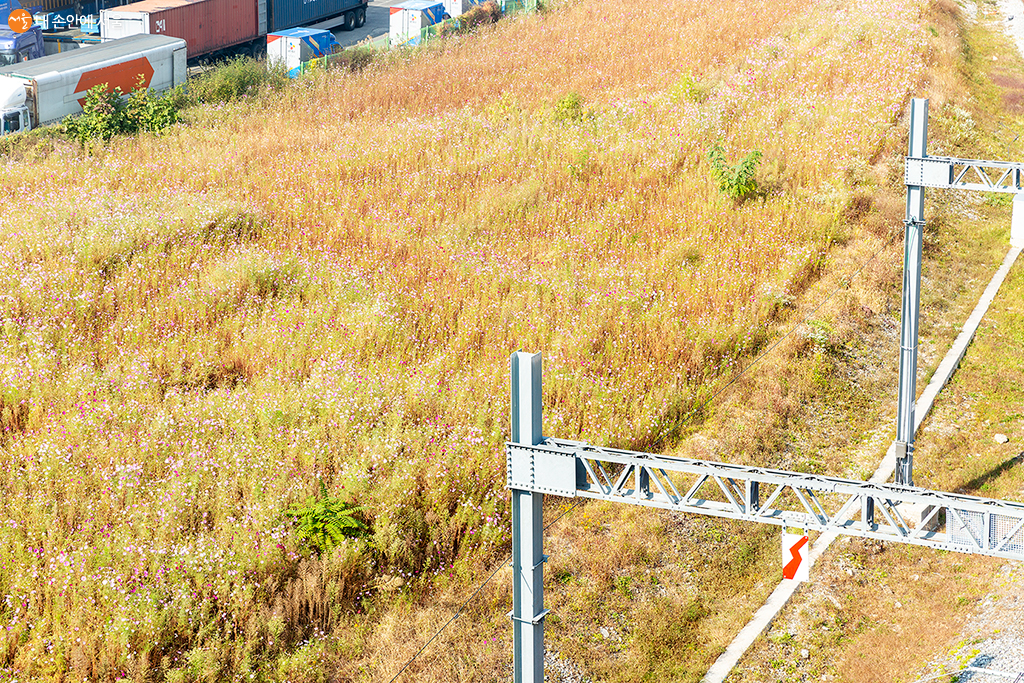 KTX와 지하철이 지나는 철로 옆에는 코스모스가 넘실거린다 ⓒ문청야
