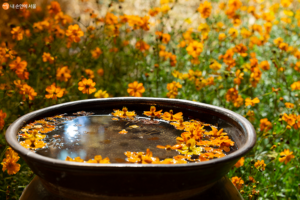 정원 곳곳에는 가을 향기를 물씬 느낄 수 있게 꾸며 놓아 참 좋았다. 특히나 필자의 눈길을 끌었던 곳은 소원을 비는 곳이었다. 황금빛 코스모스가 춤을 추는 곳에 달빛을 매달아 두고 커다란 항아리 2개를 갖다 놓았다. 항아리 뚜껑에 물을 부어 놓아, 보는 각도를 잘 맞추면 물에 비친 달을 볼 수 있게 해 놓은 것이다. 항아리 뚜껑에 담긴 달을 보기 위해 줄은 길게 이어졌다.