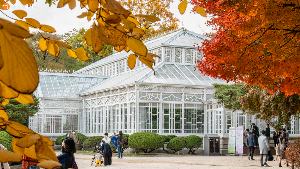 단풍나무 사이로 보이는 우리나라 최초의 서양식 온실인 창경궁 대온실이 이색적이다 Ⓒ오세훈