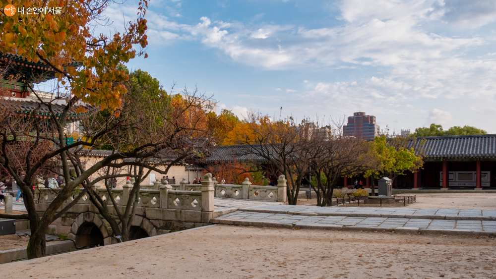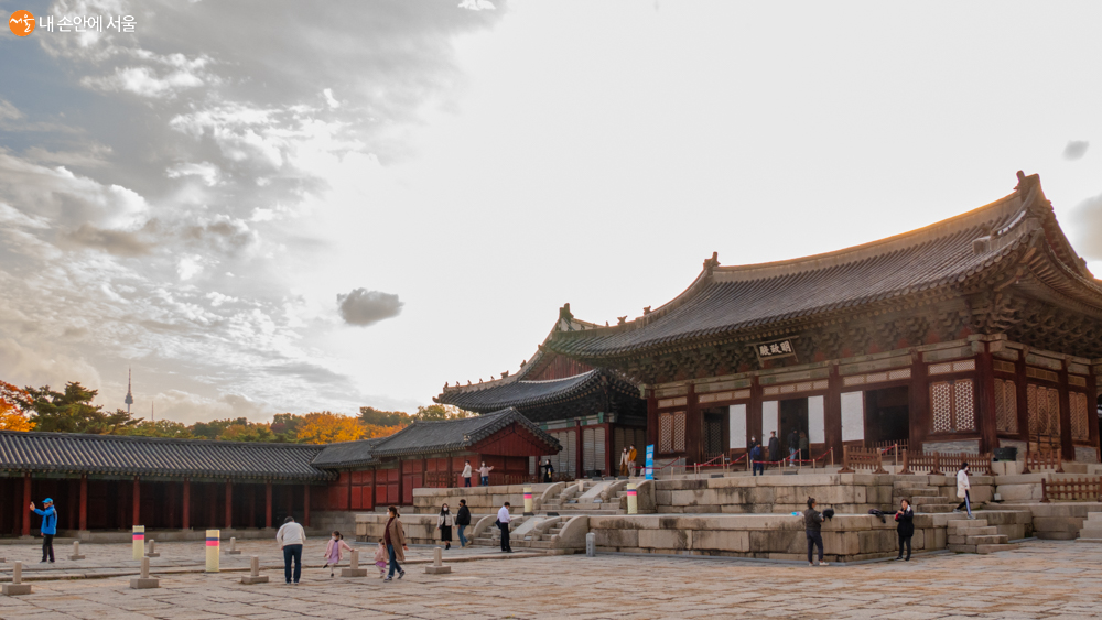 왕이 독서를 하거나 국사를 논하던 숭문당과 문정전 사이 단풍과 멀리 보이는 남산타워 풍경이 새롭다 Ⓒ오세훈
