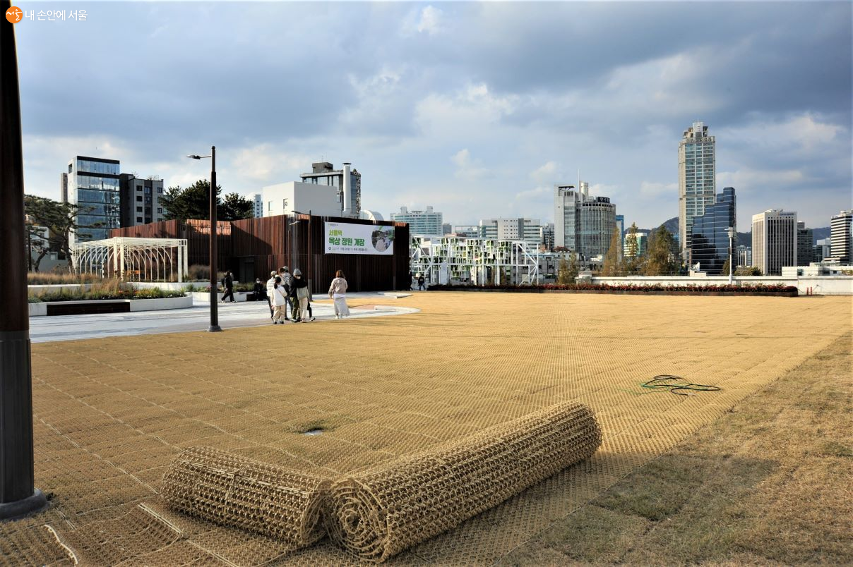식물 식재를 위하여 잔디 깔기 공사를 하고 있는 구 서울역 옥상정원 ⓒ조수봉