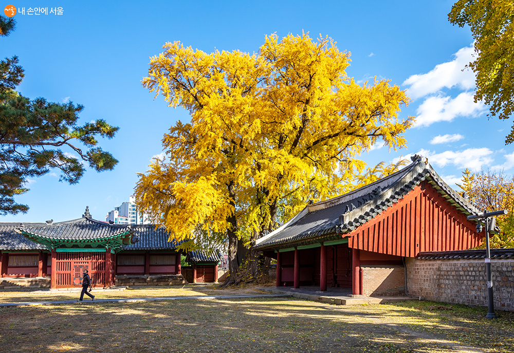 성균관 은행나무의 찬란한 황금빛은 보는 이의 넋을 빼앗을 정도이다. 성균관 은행나무는 역사성, 크기(수고 26m, 둘레 12m), 수령(약 500년)을 인정받아 천연기념물 제59호로 지정되었다. 모두 4그루의 노거수 은행나무가 있는 성균관은 조선시대 교육기관(명륜당)이자 공자와 역대 성현들의 위패를 모신 향사 공간(문묘, 대성전)이다. 다른 나무들과 달리 단풍 절정 후 낙엽이 순식간에 이루어지는 은행나무 특성상 아마도 이번 주말이 성균관 은행나무 단풍을 즐기는 최적기라고 생각된다.