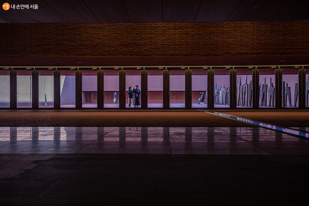 하늘광장에 늘어선 정현 작가의 <서 있는 사람들>이 유리 문에 반영되어 한층 더 웅장한 모습을 연출한다. 작품은 서소문 형장에서 순교한 44인의 성인을 무거운 기차를 떠받치고 지탱했던 침목을 사용하여 형상화했다. 결국 침목의 재탄생과 순교자의 오늘날 위상이 겹쳐지게 한 작품이다 ⓒ양인억