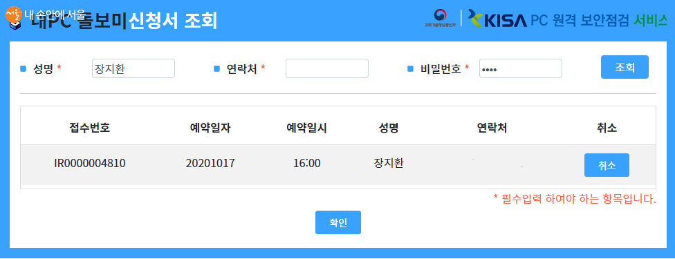 내PC돌보미 신청서 조회를 하면 예약 시간을 확인할 수 있다. ⓒ한국인터넷진흥원