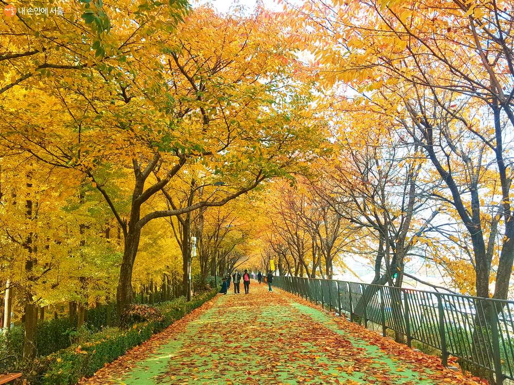 올해도 어김없이 성동구에 위치한 제방산책길에 가을이 물들였다. 송정제방길은 가을에 걷기 좋은 길로 유명하다. 중랑천을 따라 송정제방길 위로 이어지는 송정둑길은 노랗게 물든 은행나무로 황홀하기만 하다. 벚나무와 은행나무가 빼곡해 운치 있는 가을 단풍길을 만들고 있다. 많은 시민들이 아름다운 가을을 만끽하며 즐거운 시간을 보내고 있었다. 가는 길목에는 예쁜 벽화도 그려져 있어 시간 가는 줄 모르고 걷게 된다. 걷다가 힘들면, 커피 한잔할 수 있는 운치 있는 카페도 있다.