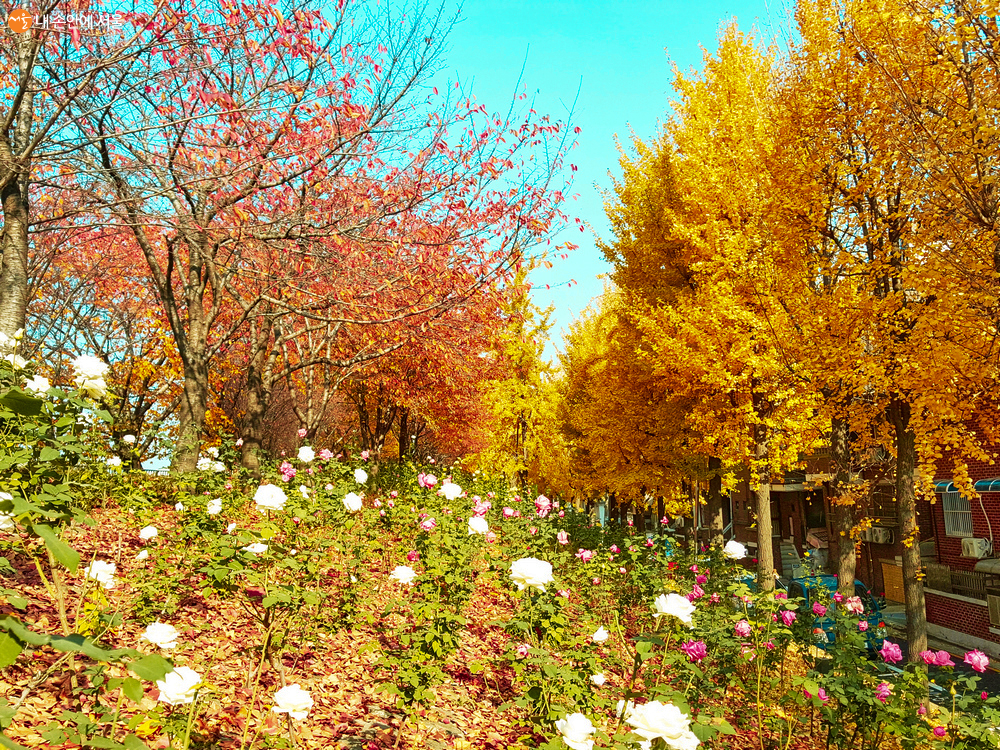 가을 장미와 어우러진 은행나무와 벚나무 ⓒ조은혜