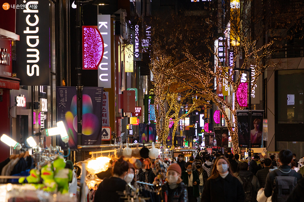 명동8길에 길게 늘어선 가판대 행렬과 오가는 시민을 호위하듯 늘어서 있는 가로수들도 희망빛축제에 동참하고 있다 ⓒ양인억