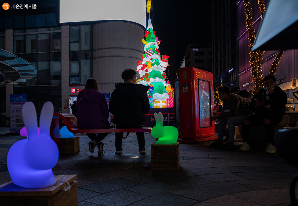 명동예술극장 앞, '크리스마트 트리'와 '멀리(Merli)' 사이 공간 곳곳에 다양한 색상의 토끼 조명이 설치되어 있다 ⓒ양인억