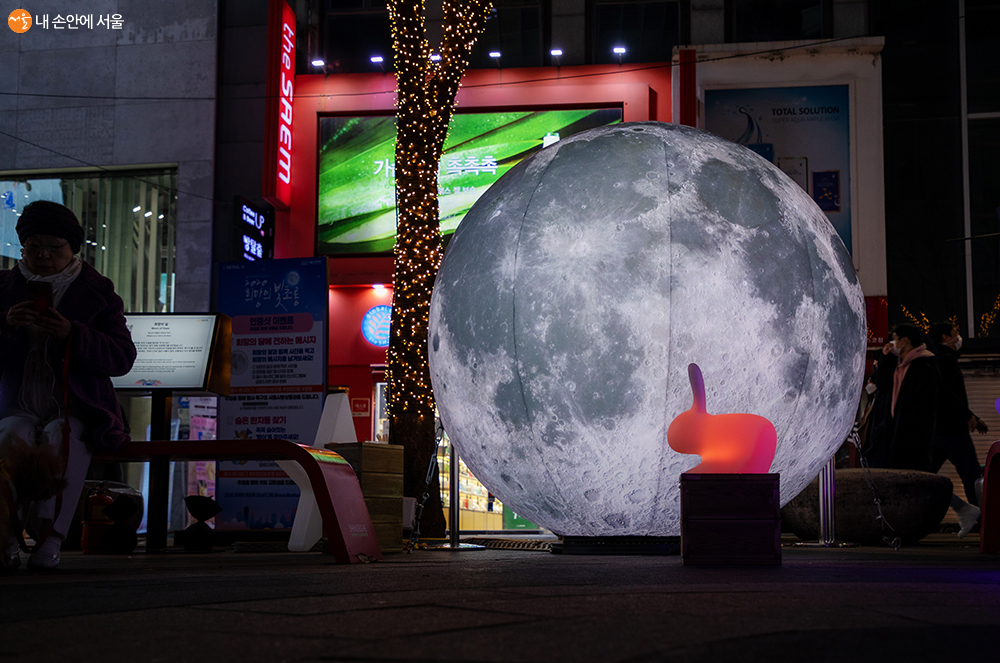 우리에게 친숙한, 희망의 상징인 보름달 (작품명 : 희망의 달)도 명동 한복판에서 코로나19로 지친 시민들을 위로하고 있다. 행사 관계자의 허락을 얻어 토끼 조형물을 잠시 이동하여 한 컷을 찍은 후 다시 원위치로 옮겨 주었다 ⓒ양인억
