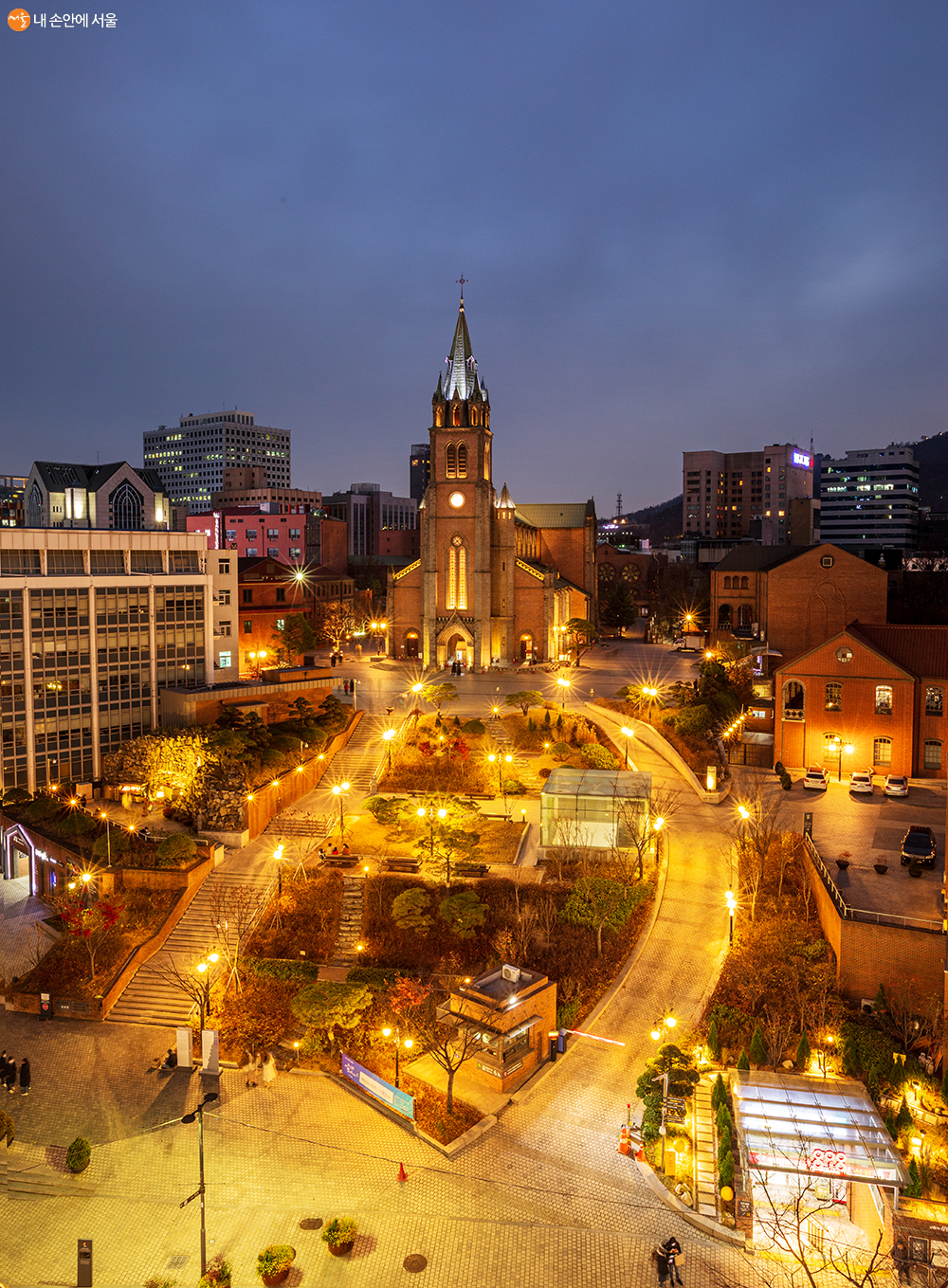 명동의 또 다른 멋진 야경 풍경. 남산 위에 서울N타워 그리고 언덕 위에 자리 잡은 명동성당이 조명으로 돋보인다 ⓒ양인억