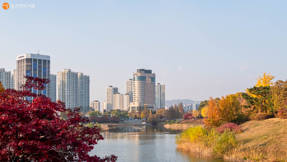 몽촌해자(몽촌호수)와 주변 올림픽공원 건물들이 풍경화같이 예쁘다 Ⓒ오세훈