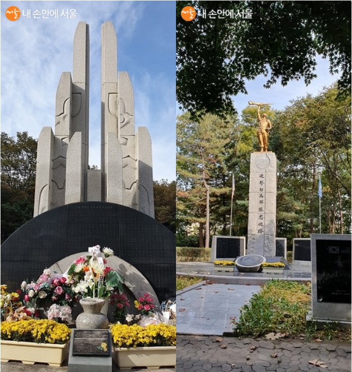 삼풍백화점 희생자 위령탑 뒷면에 희생자 이름이 새겨져 있다.(좌), 유격백마부대 충혼탑(우)Ⓒ박종섭