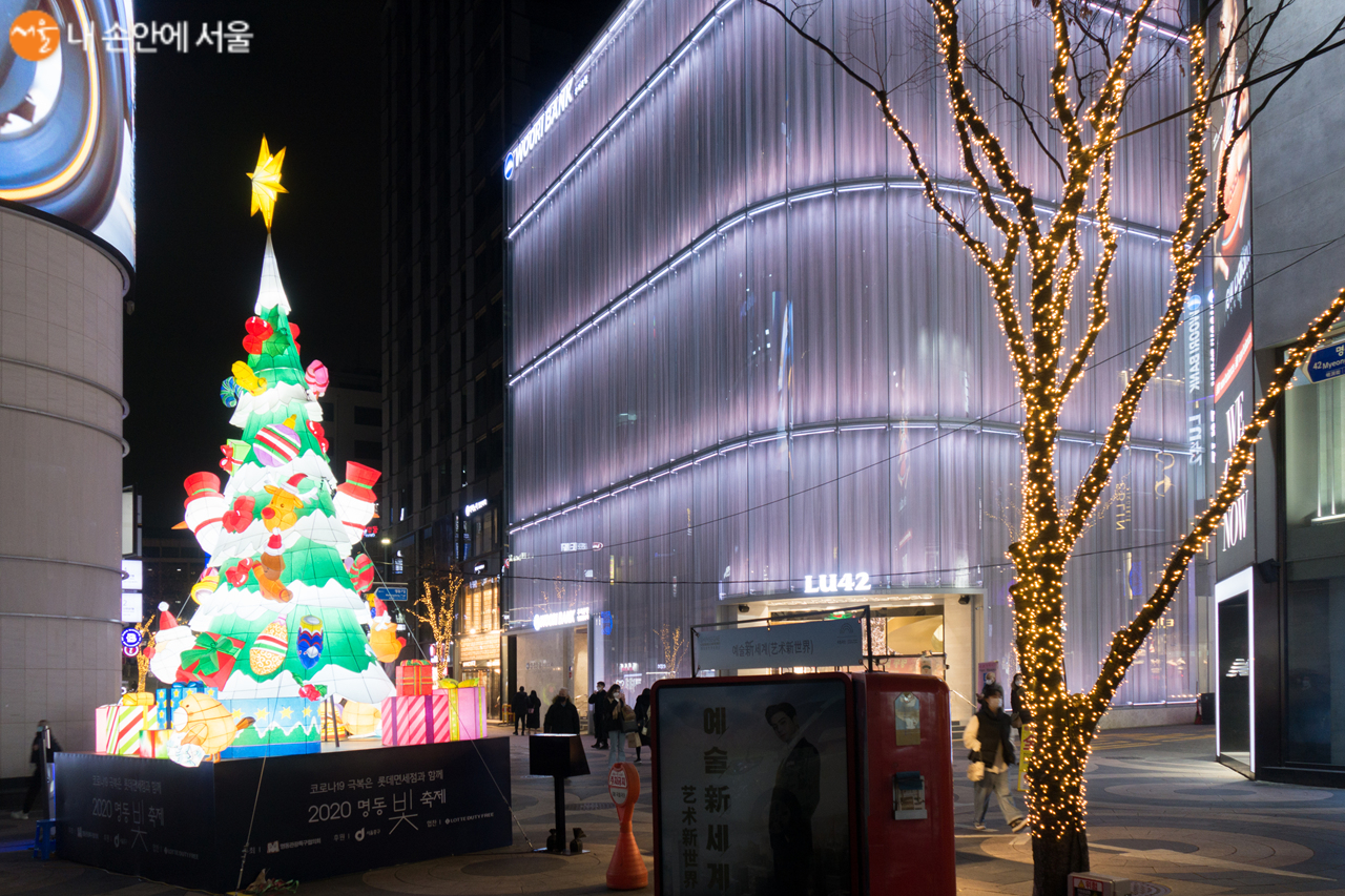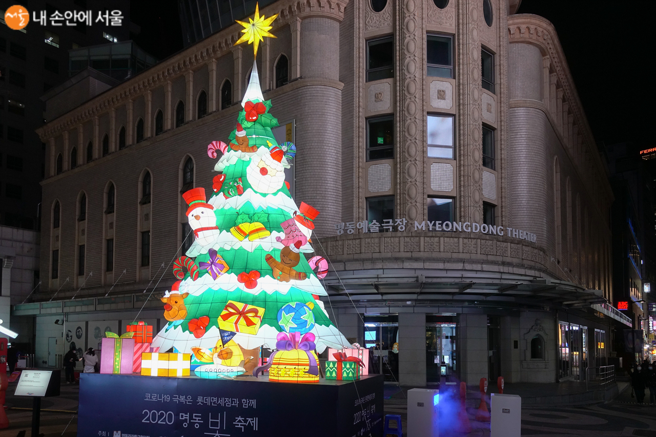 지난 13일부터 22일까지 명동 예술극장 앞 광장에는 서울시와 서울관광재단 주관의 '2020 희망의 빛초롱 행사'가 개최되었다. 서울관광재단에서 운영하는 빛초롱축제는 끝났지만, 명동의 ‘빛 축제’는 계속되고 있어 둘러보았다. 명동의 가로수가 LED 조명 옷을 입어 빛을 내고 있었다. 화려한 한지 공예로 제작된 7m 높이의 크리스마스트리, 그림자 포토존 등이 있어 무거움을 덜어낼 수 있었다. 특히 한국, 싱가포르 수교 45주년을 기념해 싱가포르를 상징하는 머라이언 캐릭터 멀리(Merli)가 설치돼 한층 더 화려하고 장엄한 명동 '2020 희망 빛 축제'가 되는 듯하다. 명동에 설치된 크리스마스트리와 멀리는 2021년 1월 15일까지 만날 수 있다.