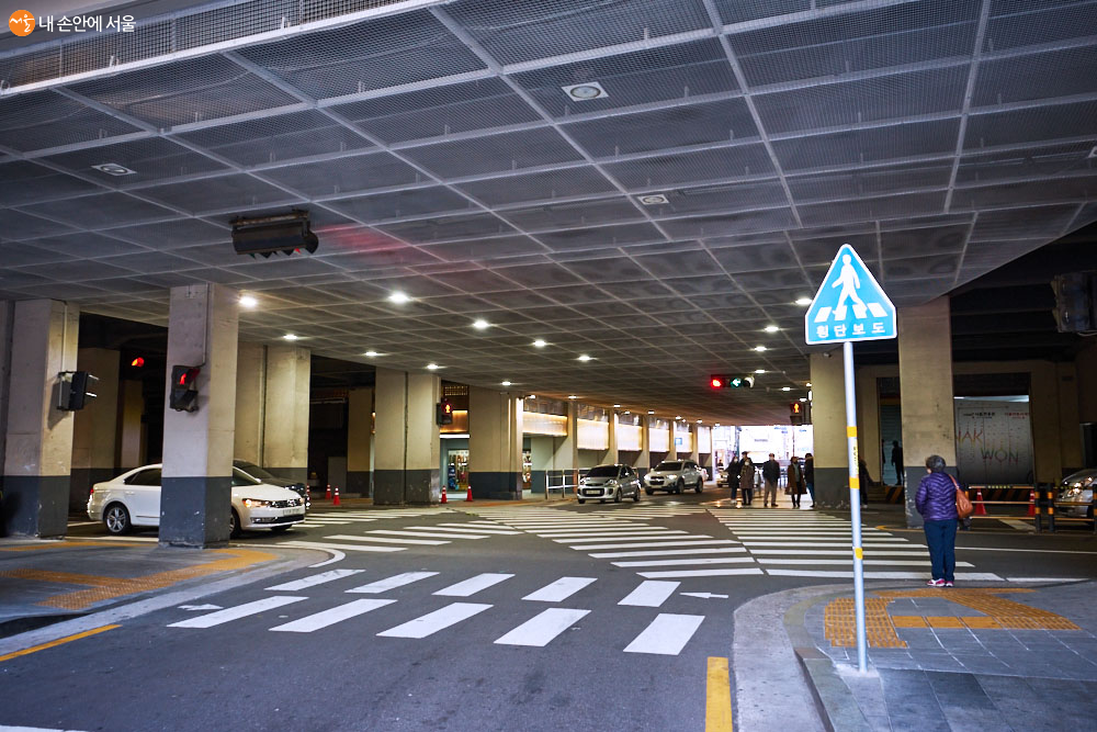 낙원상가 하부 공간으로는 남북과 동서 방향으로 도로가 지나간다. 어둡고 침침한 공간으로 기억 속에 남아 있던 곳이었으나 정비 사업을 통해 오히려 이색적인 느낌을 주는 독특한 보행 공간으로 변화했다 ⓒ이정규