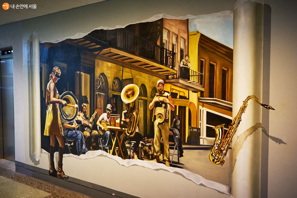 낙원상가 2~3층에는 300여 곳의 악기 전문점이 있다. 상가 복도에 이곳의 정체성을 대표하는 듯한 멋진 벽화가 그려져 있어 눈길을 사로잡는다 ⓒ이정규