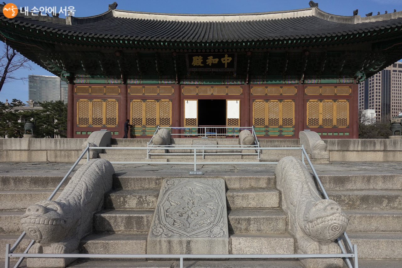 중화전 계단의 답도(가마를 탄 왕이 그 위로 지나가는 길이란 뜻)에 새긴 사각형 안의 용 문양, 황제국의 위용을 보여준다 Ⓒ김인수