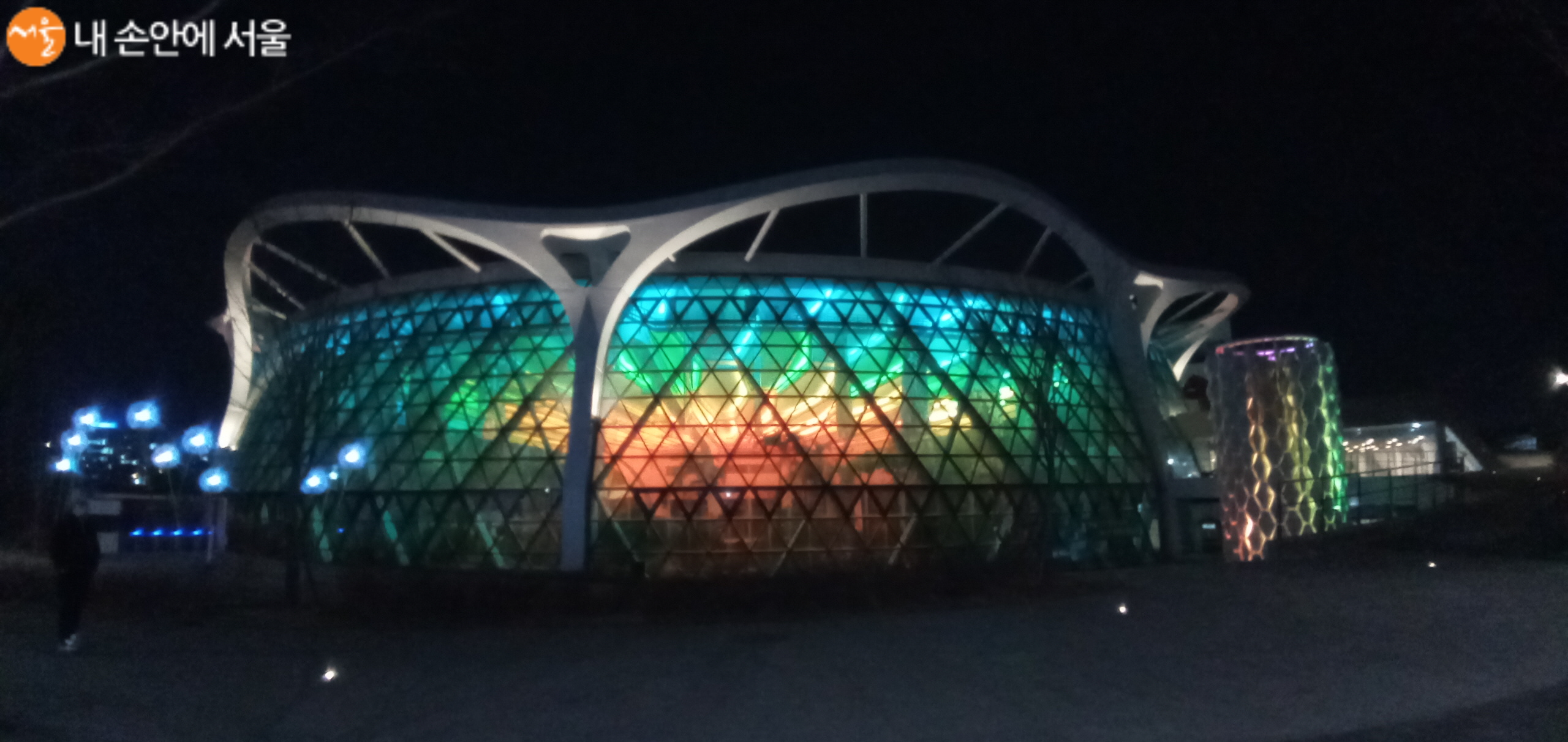밤이 되자 마곡 서울식물원 외관이 알록달록 빛으로 빛나기 시작한다 ⓒ이경호