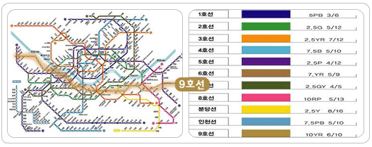 또 서울시 도시디자인위원회에도 2차례에 걸쳐 자문을 구하였다. 한편 노선색은 지하철 9호선 1단계 공사구간인 김포~여의도~고속터미널 25.5Km 에 건설되는 25곳의 역사와 차량내 종합노선도, 스크린 도어 및 외부풀사인 등 각종 종합안내유도사인에 폭넓게 적용할 예정이다. |
