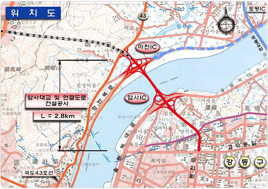 폭 4~6차로 연장 2.8㎞ 구간 …국비 1,700억 지원받아 착공 4월부터 강동구와 구리시를 잇는 암사대교가 착공된다. 규모는 폭 4~6차로 연장 2.8㎞로 구리시 아천동에서 강동구 암사동 둔촌로까지 이어질 전망이다. 공사는 국비 1,700억(총사업비 3,400억중 50%)을 지원받아 4월 착공하며 2010년 완공을 목표로 추진된다. 암사대교가 완공되면 서울 동부지역의 강·남북 직결로 설치로 도시의 균형적인 발전이 도모됨은 물론 구리시에서 서울 동남부지역으로의 접근이 향상된다. 또 올림픽대로, 강변북로 등과 연계하여 간선도로망을 구축하게 된다. 시 관계자는 “암사대교 건설이 완료되면 서울 동부권의 늘어나는 교통수요에 대처할 수 있고, 이 지역 발전에도 도움이 될 것”이라고 말했다. 문의 : 서울시 도로계획과 ☎ 02-3707-8133