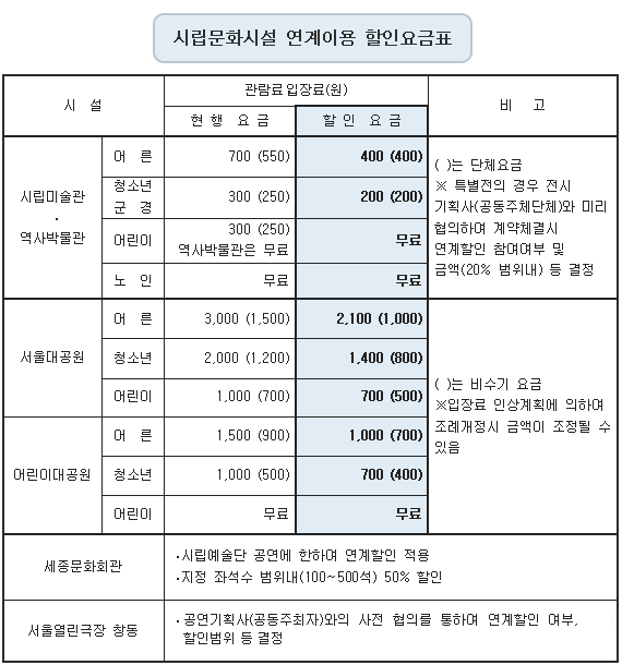 특별전의 경우 전시기획사와 사전 협의해 할인여부, 할인폭 등을 결정한다. 서울시는 우선 오는 4월부터 ‘시립미술관-서울역사박물관’, ‘서울대공원-어린이대공원’,
