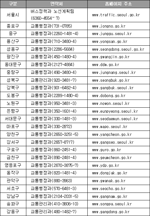 문의 : 서울시 교통개선기획단 버스정책과 ☎ 02)6360-4562 홈페이지 http://bus.seoul.go.kr/ |
