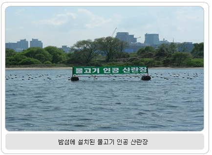 한강 생태계 복원 및 어족 자원 다양화 위해 산란철마다 설치 한강시민공원사업소가 매년 물고기 산란철(4월 중순~6월 하순)마다 한강에 설치하는 인공 산란장 수초에 물고기가 산란해놓은 알들이 제법 풍성해졌다. 한강시민공원사업소는 한강 생태계 복원 및 어족 자원의 다양화를 위해 산란철마다 탄천, 중랑천, 밤섬, 선유도 등 물고기의 산란에 적합한 장소 12곳에 인공산란장을 설치해 왔다. 인공산란장은 부표 아래에 50m× 45m 크기의 합성섬유로 만든 인공수초를 매다는 방법으로 조성하는데, 산란을 위해 한강을 찾는 물고기들에게는 아주 요긴한 산란 장소가 되고 있다. 올해는 이상 저온 현상으로 물고기들의 산란 시기가 예년에 비해 20일 가량 늦어진 가운데, 잉어·붕어·누치 등이 한강으로 떼 지어 올라오면서 인공 산란장에 알을 산란한 것. 산란된 알은 17℃에서 약 1주일, 20℃에서 4~5일, 23℃에서는 3일 정도면 부화하며, 부화된 어린 자어들은 난황을 흡수하고 그 후엔 동물성 플랑크톤을 먹고 자란다. 부화 후 30일이 지나면 2~3㎝ 자라, 떼를 지어 유영하면서 수서곤충이나 수생식물 등을 먹는 잡식성으로 변한다. 한강시민공원사업소 관계자는 공원을 이용하는 시민들에게 “산란을 위해 몰려든 물고기를 보호하기 위해 인공산란장 부근에서 큰 소리 지르기나 달리기 등을 자제하여 산란 시 물고기들이 스트레스를 받지 않도록 협조해줄 것”을 당부했다.
