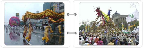 페스티벌 마지막 날인 5일에는 역동적인 서울의 힘을 느낄 수 있는 다이나믹한 프로그램이 많다. 그 첫 번째가 바로 8도 민속 대동놀이, 우리 민족의 기와 힘을 모아주었던 민속놀이들이 태평로 일대에