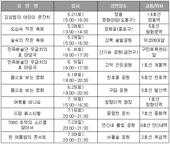 공연일자로 보면 21일에는 창동 문화마당에서 ‘강성범의 어린이 큰잔치’, 어린이 난타 공연 등이 열리며, 28일과 29일에는 경희궁과 강북 솔밭공원에서 각각 ‘도심 속 작은 축제’와 ‘숲속의 작은 축제’가 개최된다. 6월과 7월에도 매 주말마다 금천구 산기슭공원과 고척 근린공원, 천호동 공원, 구암공원, 청량리역 광장, 중랑천 둔치, 연신내 물빛공원, 서울숲 공원 등에서 ‘드럼 페스티벌’, ‘여행을 떠나요’, ‘한여름밤의 콘서트’ 등 다채로운 행사가 열린다. 서울시 박희수 문화과장은 “서울의 역사와 문화가 숨쉬는 곳 뿐만 아니라 문화소외지역도 마다않고 찾아가는 ‘문화 나누기’를 통해
