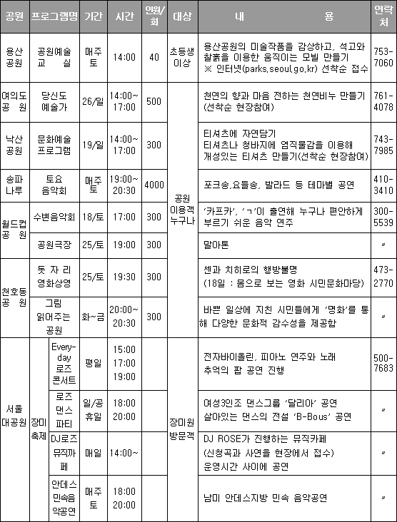 만들기를 해보는 ‘공원예술교실’을 운영하고 있다. 초등학생 이상이라면 누구나 참가가능하다. 송파나루공원과 월드컵공원에서는 매주 토요일 포크송, 요들송, 발라드 등 편안한 음악 위주로 선곡한 토요 음악회를 감상할 수 있다. 월드컵공원, 천호동 공원에서는 ‘말아톤’, ‘센과 치히로의 행방불명’ 등 가족, 친구, 연인과 함께 시원한 자연 속에서 영화를 감상할 수 있도록 했다.