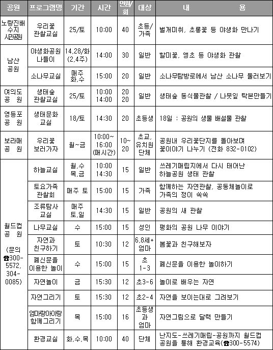 친구하기, 자연그리기 등을 통해 자연에 대해 얘기하고 느껴보는 시간을 마련했다. 공원이용 프로그램은 서울의 공원 홈페이지(parks.seoul.go.kr)를 통해 자세히 볼 수 있으며, 인터넷 예약도 가능하다. 문의 : 서울시 푸른도시국 공원과 ☎ 3707-9613 인터넷 홈페이지 parks.seoul.go.kr
