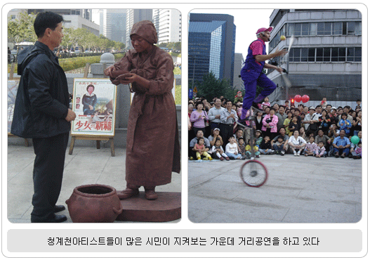 문화가 있는 곳... 청계천 아티스트의 활발한 거리공연 소원기원 팔석담, 청계천 2층버스, 시티투어 버스, 도보관광코스, 청계8경 등 관광코스 운영으로 청계천을 이용하는 시민들이 다양한 방법으로 청계천을 접할 수 있는 것도 색다른 즐거움이다. 사전 신청을 통해 운영하는 대부분의 코스에는 문화전문해설사가 동행, 청계천에 대한 상세한 설명을 곁들인다. 문화의 거리인 청계천에서 거리예술가들(청계천 아티스트)의 활동을 빼놓을 수 없다. 47년만에 새물길이 열린 지난 해 10월 1일부터 청계천에서 활동을 시작한 거리예술가들은 석고마임 퍼포먼스, 클래식 연주, 스트리트 댄스, 풍물, 힙합 등 창의적인 아이템으로 다양한 연령층을 매료시켜왔다. 청계천에서 이러한 거리예술가들을 만나는 일은 더 이상 낯설지 않다. 청계천아티스트는 이미 청계천의 새로운 명물로 등극하였다.