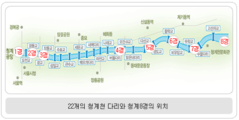 역사가 살아 숨쉬는 공간... 청계천문화관 운영 청계천은 역사, 문화, 환경이 공존하는 도심에서 보기 드문 자연생태하천으로 청계천에는 모전교, 광교, 두물다리 등 22개의 다리가 있다. 또 5.84Km의 청계천을 걷다보면 서울시가 청계천의 역사를 복원하기 위해 애쓴 흔적을 곳곳에서 접할 수 있다. 광통교 복원을 비롯 양안 석축 보존, 수표교 복원 설계, 정조반차도 등 서울 6백년의 역사가 곳곳에서 배어나오고 있어 서울의 야외 역사박물관 느낌을 준다. 특히 서울시는 과거와 현대가 공존하는 청계천의 특징이 잘 드러나도록 청계광장, 광통교, 정조반차도, 패션광장, 청계천빨래터, 소망의 벽, 존치교각과 터널분수, 버들습지 등 8곳을 청계8경으로 지정하였다. 청계광장에서부터 물길을 따라 걷다보면 이들을 모두 만날 수 있다.