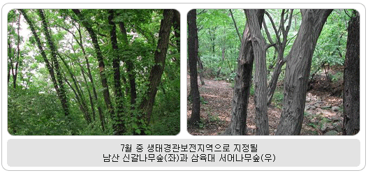 남산 신갈나무숲, 창덕궁 후원 갈참나무숲, 삼육대 서어나무숲 3개소 30만 평 지정 서울시 생태경관보전지역이 30만 평 더 늘어날 전망이다. 생태경관보전지역은 학술적 연구가치가 높거나 다양한 생물이 서식하는 등 보전가치가 있는 우수생태지역의 훼손 및 개발을 막기 위한 장치로 서울시에서는 1999년부터 이를 시행하고 있다. 현재까지 지정 1호인 한강 밤섬 비롯하여 둔촌동 습지, 탄천, 방이동 습지, 암사동 습지, 진관내동 습지, 고덕동 습지, 청계산 원터골 낙엽활엽수숲, 헌인릉 오리나무 군락지 등 9개소가 서울시 생태경관보전지역으로 지정·관리되고 있다. 이번에 추가로 지정되는 3개 지역은 서울에서 보기 드물게 산림생태계가 유지되는 곳으로 보전상태가