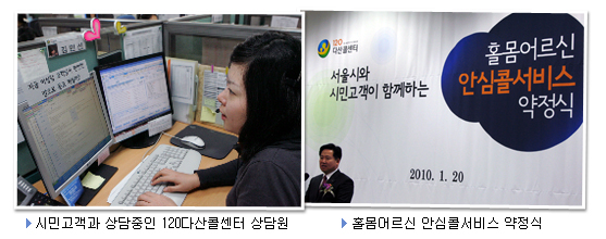 전화, 그 이상의 사랑을 전하는 안심콜 서비스 “너무 참말로 고마워~. 이렇게 어려운 시기에 앉아 있을 때나 누워 있을 때나 항상 생각 나. 고마워~!” 연탄 400장과 쌀 1포대, 그리고 임나영 상담원에게 성탄절 선물로 받은 스웨터에 박은임 할머니(가명, 77세, 노원구 중계본동)는 몇 번이고 고맙다는 말을 전하셨다. 안심콜서비스를 통해 할머니와 인연을 맺은 임나영 상담원은 겨울이 되고 한파가 계속되자 작은 방에서 연탄을 아끼려고 춥게 지내실 할머니가 걱정이 되어 상담팀장님께 사정을 전달했다. 소식을 들은 120다산콜센터 직원들은 지난 연말 할머니를 위해 자체적으로 모은 봉사기금(천원의 보람)을 활용해 연탄과 쌀 등 선물을 준비해 할머니를 찾았다. 하루가 48시간처럼 지루하고 힘들어도 마음 나눌 사람 하나 없어 서럽기만 했었던 할머니의 마음을 녹여준 안심콜서비스와 유례없는 한파에 걱정 많았던 할머니의 몸까지 녹여드린 120다산콜센터 직원들의 마음이 담긴 선물에 연신 웃는 할머니의 얼굴은 세월의 무게에 패인 주름마저 즐거워 보이게 만들었다. 노환으로 거동이 불편하고 안부를 챙겨주는 이가 전혀 없어 '죽어도 누구 하나 알 수 없는 형편'이라며 안심콜서비스를 신청하신 유지환(가명, 78세, 동작구 상도동) 할아버지도 그 이상의 도움을 받았다. 박현정 상담원은 파킨슨 증상과 함께 왼팔이 마비됐지만 왼쪽 하체는 비교적 괜찮아 병원에 겨우 다니신다는 할아버지의 상태를 큰사랑노인전문병원장이시자 '120다산나누미' 봉사단장인 이상일 박사에게 부탁했고, 박사는 상담 후 어르신 집과 가까운 병원에 제출할 수 있는 소견서를 작성해드렸다. 하루 2~3회 안부전화로 시작하여 가족 이상의 정을 전해온 안심콜서비스가 지난 20일 '120데이'를 맞이하여 ‘시민고객과 함께하는 홀몸어르신 안심콜 서비스 약정식’을 가졌다. ‘시민고객께 받은 사랑을 되돌려 드리자’는 취지로 출발한 사랑의 불씨가 범시민 봉사운동의 불꽃으로 일어나게 된 것이다.