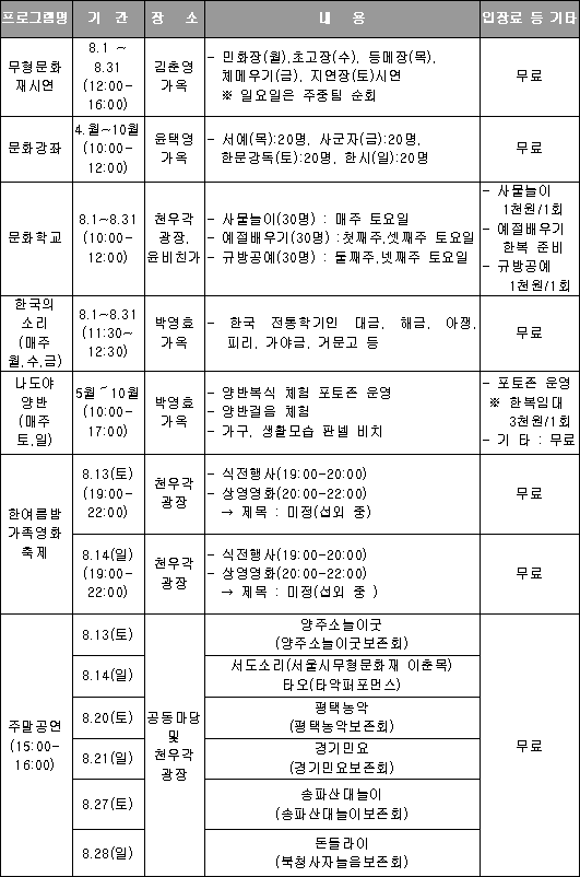 8월 27일까지 이어지는 감상회에서는 ‘드럼캣 콘서트’, ‘보이쳐 콘서트’, ‘마파도’, ‘간 큰 가족’, ‘배트맨 비긴즈’, ‘안녕, 형아’, ‘인어공주’, ‘밀리언 달러 베이비’, ‘천군’ 등이 상영된다. 운현궁에서는 8월 13일 청소년 대상의 역사퀴즈 프로그램이 열리고, 매주 일요일에는 피리, 춤, 북, 명창의 노래를 일요예술무대에 올려 전통문화의 향연을 마련한다. 서울열린극장 창동에서는 기상과학뮤지컬 ‘판도라의 날씨상자’가 8월 7일까지, 큐빅스 대모험이 8월 10일부터 28일까지 공연된다. 서울시립미술관에서도 아동 대상의 교육 강좌가 다양하게 마련되어, 청소년들의 문화 욕구를 충족시켜주는 데도 보탬이 될 것으로 보인다. 8월 주요 문화 프로그램
