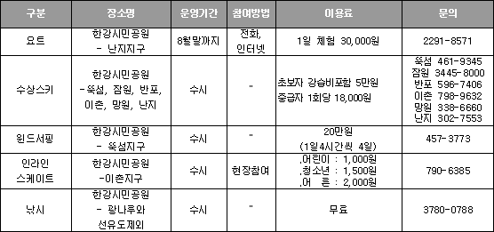 더구나 공부 때문에 휴가를 못가는 청소년들이 있는 가정은, 가까운 공원 프로그램에 참가하면서 공부와 나들이, 피서를 한방에 해결하는 방법도 있다. 8월 말까지 운영하는 한강시민공원의 야외수영장과 무료로 개방하는 일광욕장, 어린이대공원과 마들 근린공원의 수영장은 바다 못지않은 즐거움을 선사한다. 짜릿한 속도감으로 무더위를 날려버릴 수상스키(뚝섬 등 6개소)와 윈드서핑(뚝섬)도 한강에서 즐길 수 있으며, 요트(난지), 인라인스케이트(이촌), 낚시(광나루와 선유도 제외) 등도 자유롭게 선택할 수 있다. 캠핑을 원하는 가족은 난지캠핑장과 서울대공원 캠핑장으로 짐을 꾸려 떠나고, 자연을 원하는 가족은 근교의 산을 찾아 숲 해설가가 진행하는 자연학습프로그램을 십분 활용하자. 남산, 관악산, 인왕산, 앵봉산 등에 식생·곤충 관찰, 삼림욕, 명상 등 다채로운 생태프로그램이 마련돼 있다.